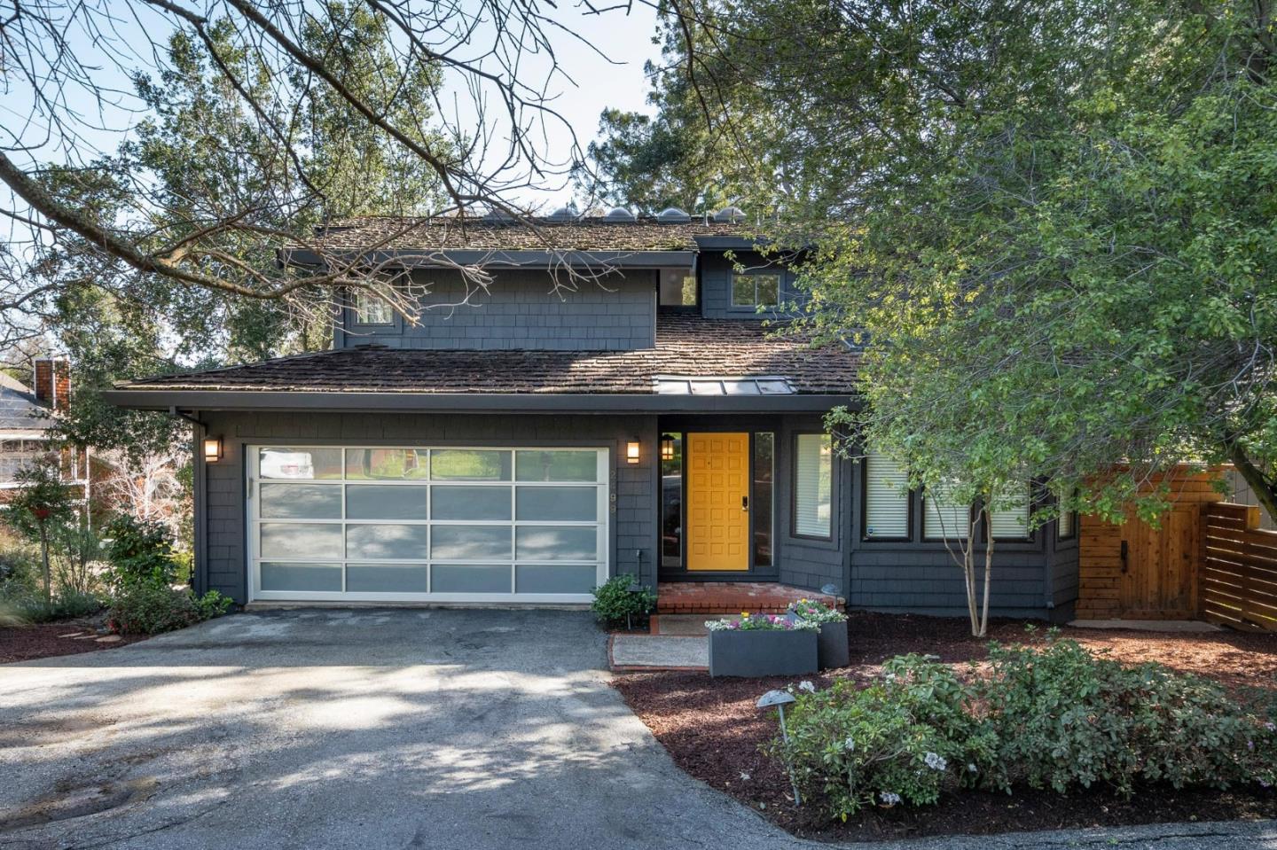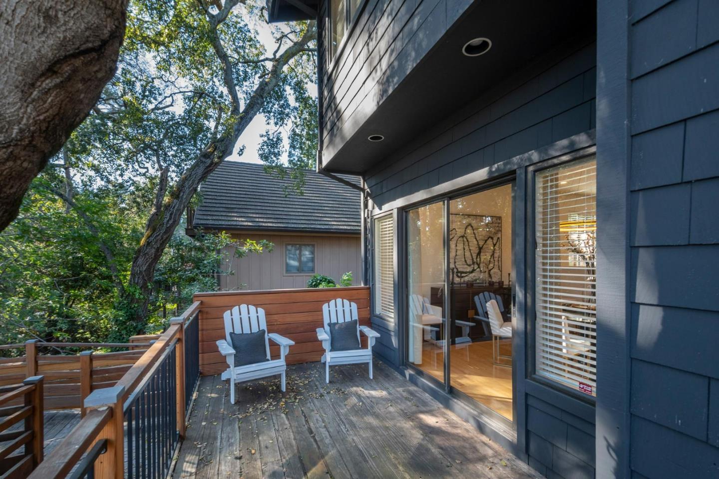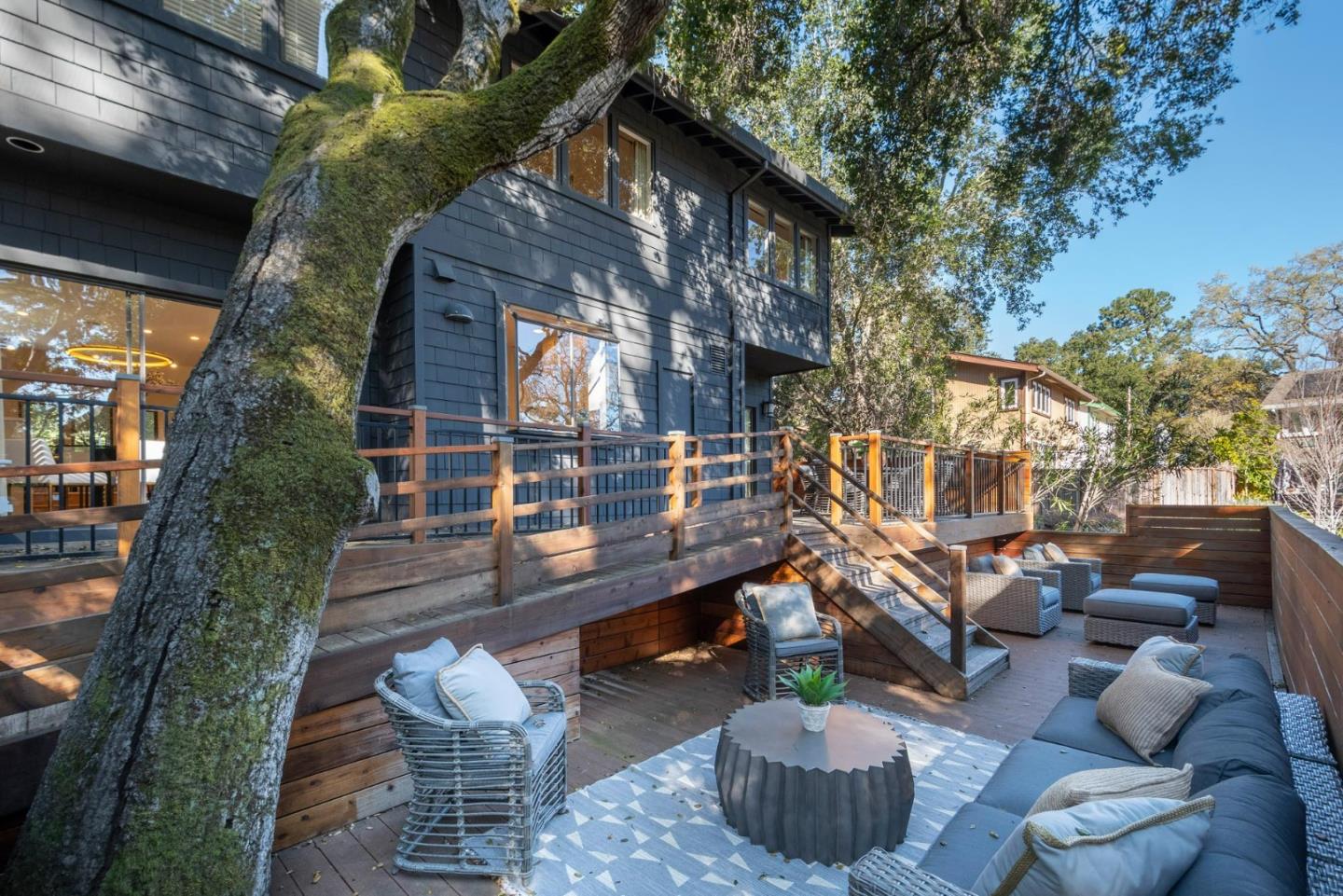 Nestled in the tranquil enclave of Stanford Weekend Acres, this captivating residence offers a true sense of living amidst nature. Upon entry, a welcoming foyer with soaring ceilings and oak hardwood floors leads to a spacious living room boasting a charming fireplace and abundant natural light from multiple skylights. The seamless flow extends to the dining room, ideal for both relaxation and entertaining. The stylish kitchen features dark blue and white cabinets, ample storage, and a picturesque view of the backyard, connecting effortlessly to the cozy family room. Step outside to expansive multi-tiered decks, perfect for al fresco dining and entertaining amidst lush greenery. Upstairs, discover a serene primary suite flooded with natural light, multiple closets, and a chic en suite bathroom. Three additional sunlit bedrooms share a designer bathroom with a chic double vanity and water closet. Enjoy the convenience of a washer and dryer room on the top level. With an attached two-car garage, previously utilized as an office, and proximity to excellent schools, hiking trails, and a vibrant outdoor lifestyle, this property epitomizes California living at its finest.